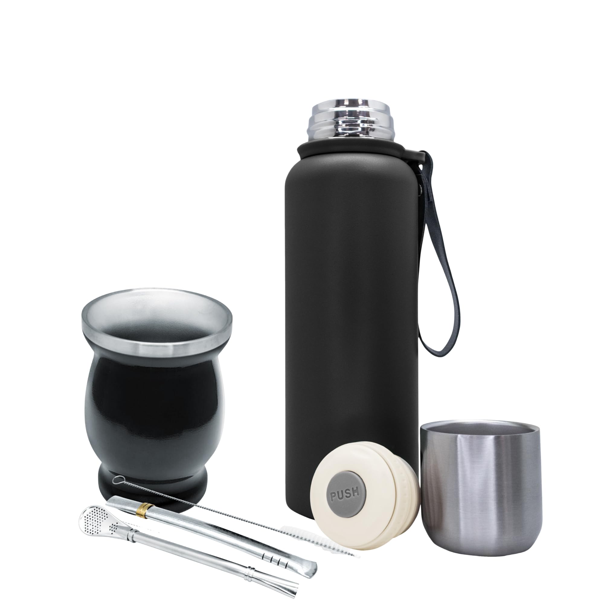 NERTHUS FIH 1595 – Kit de Mate con Vaso de Doble Pared de Acero Inoxidable de 250 ml + Dos Bombillas Pipas para Mate con cepillo limpiador + Termo Acero Inóxidable 750ML
