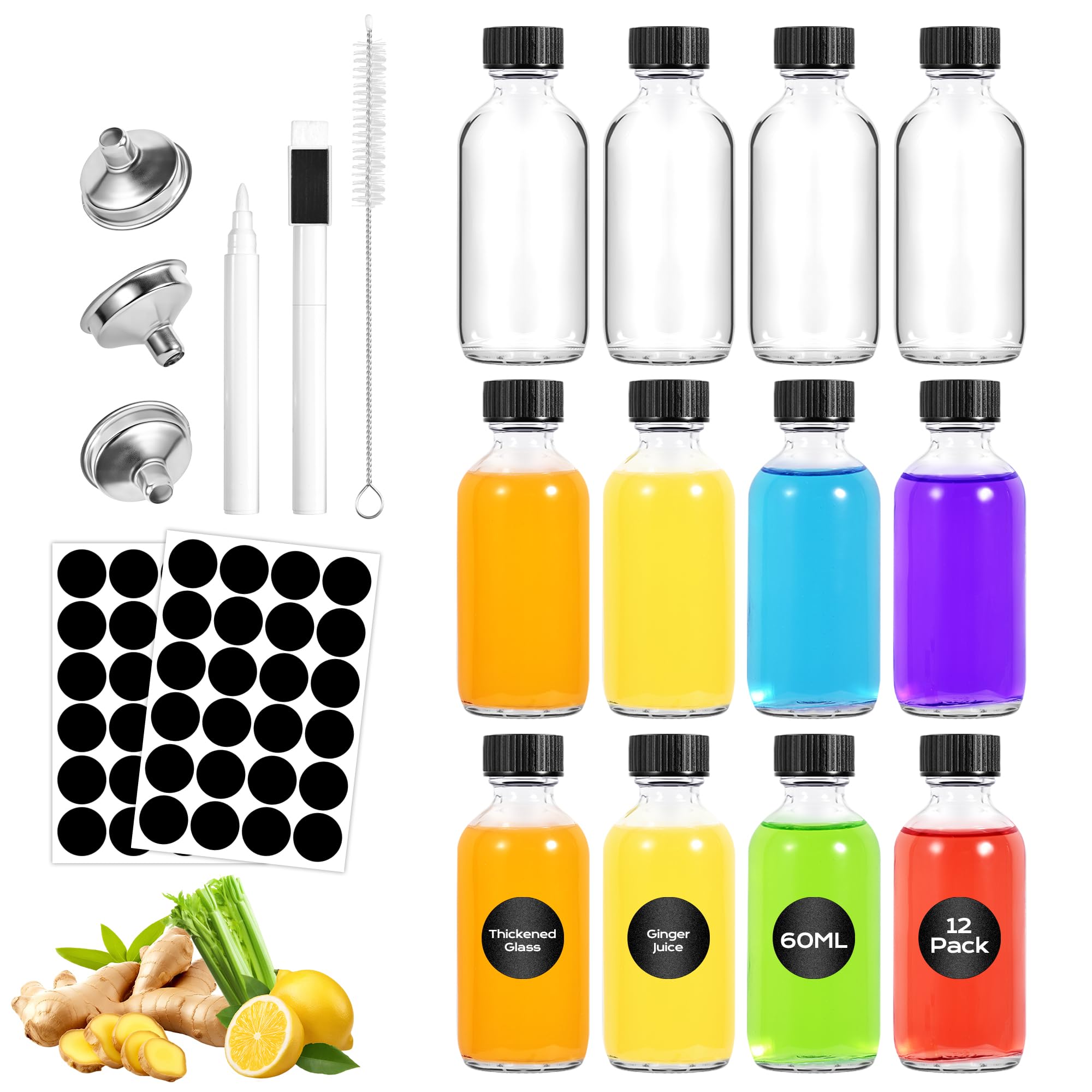 Yokuni 12 x Mini Botellas de Cristal 60ml, Botellitas Pequeñas Para Rellenar Embudos, Etiquetas y Bolígrafo, Shots Botellitas Set para Mermeladas Caseras, Especias, Favores de Boda y Fiestas