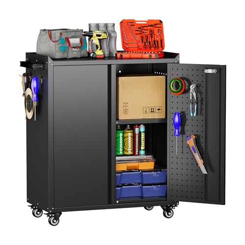 SUPEER Gabinete de herramientas de metal con ruedas y tablero de clavijas, 87x66x35cm, gabinete de almacenamiento para garaje con cerradura, puertas y estante con 4 ganchos para garaje, hogar