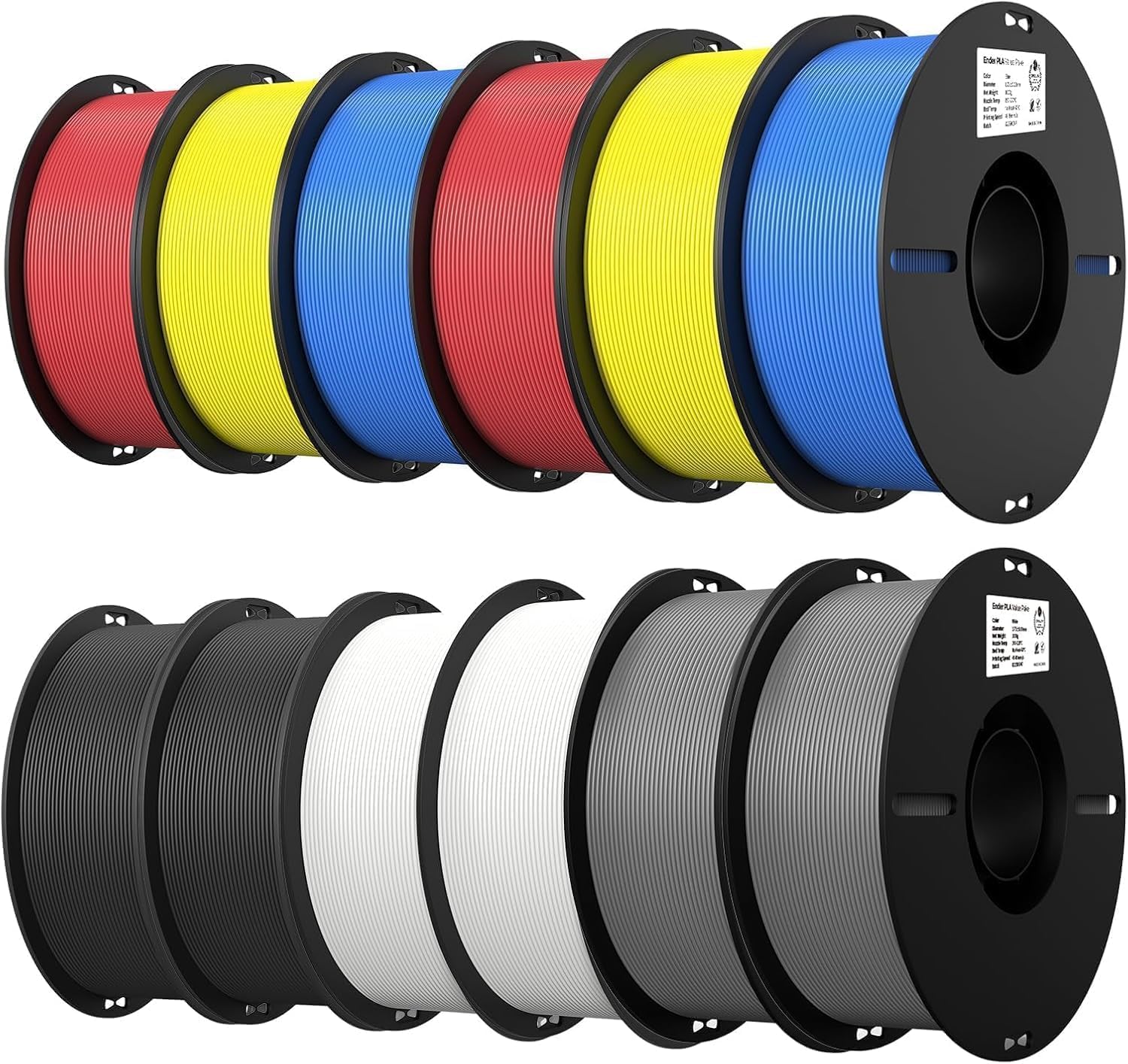 Creality Ender PLA Filamento 12-Pack 1,75 mm – 2× Negro, Blanco, Gris, Azul, Rojo, Amarillo – Para Impresoras 3D