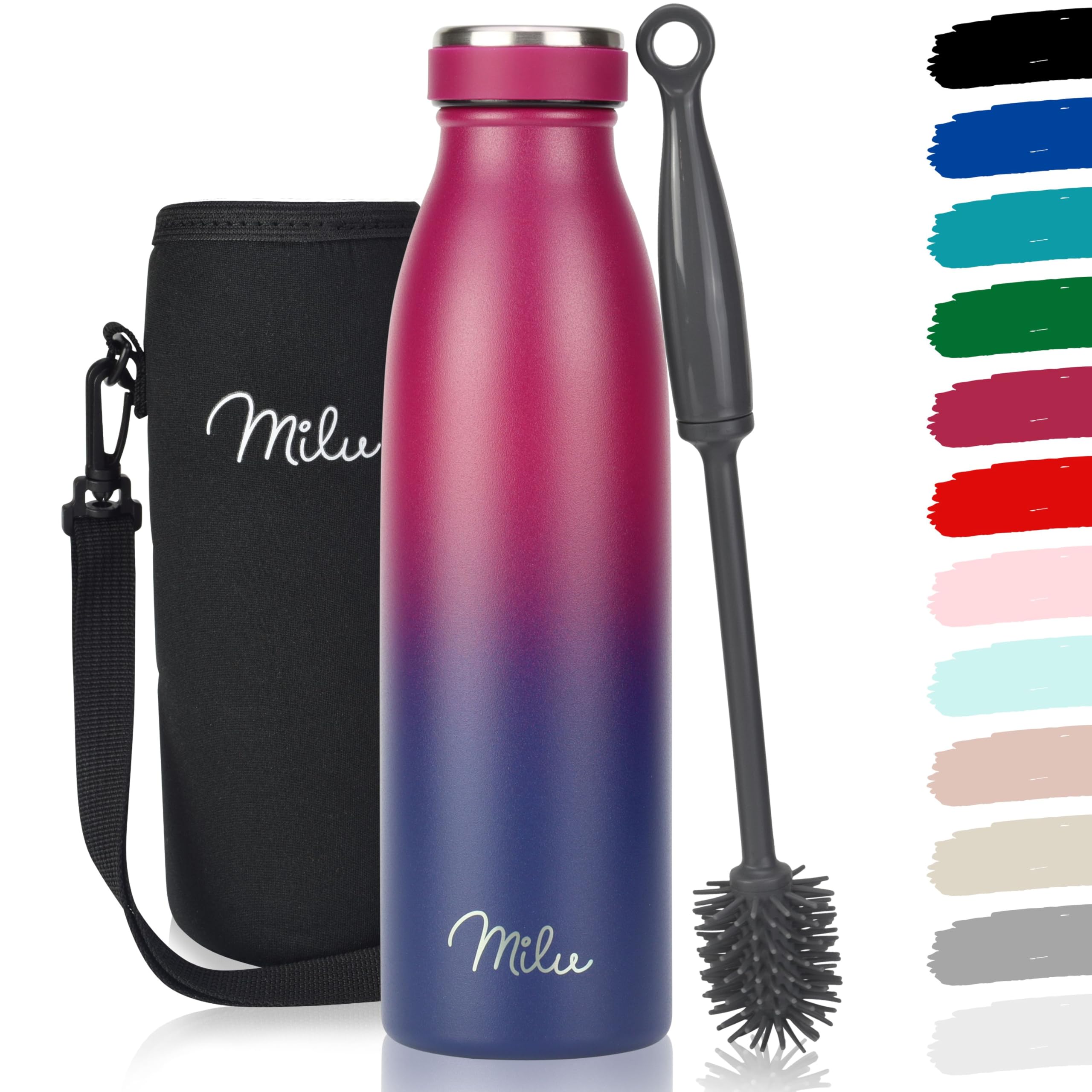 Milu Botella de acero inoxidable de 350ml 500ml 750 ml 1 L 1,5 L botella de agua aislada, termo a prueba de fugas, doble pared, apta para ácido carbónico + cepillo de limpieza (Azul Baya, 500ml)