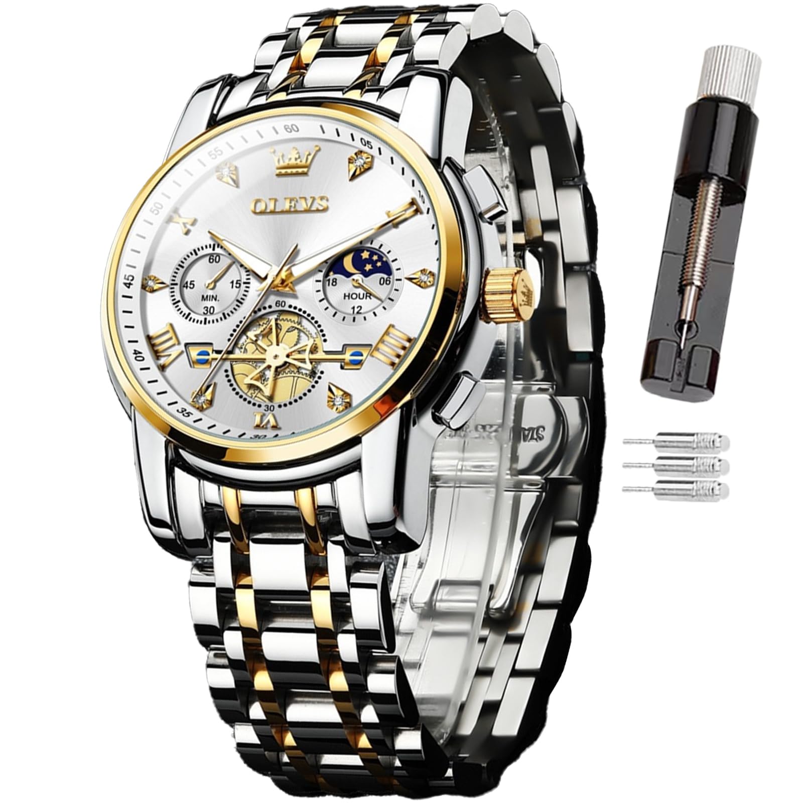 OLEVS Reloj para Hombre, con código de Tiempo, Correa de Acero Inoxidable, Resistente al Agua, Multifuncional, subesfera, Reloj de Negocios, Cuarzo Redondo, Relojes de Lujo para Hombre