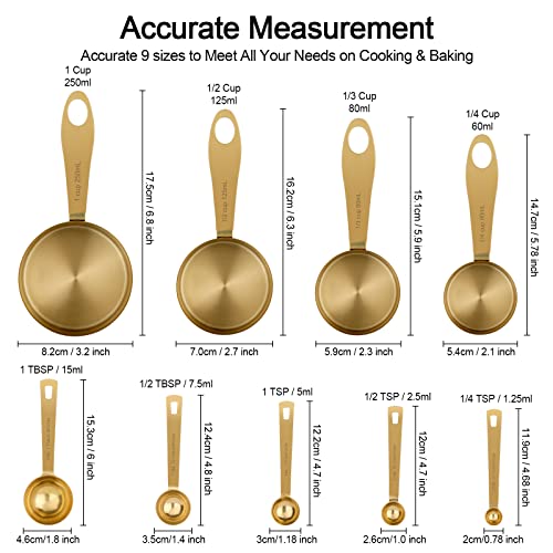 Cuteefun Cucharas Medidoras y Tazas Medidoras, 9 Piezas, Mango de Acero Inoxidable con Medidas MéTricas y US, Taza Medidora de Ingredientes Secos y Líquidos para Hornear y Cocinar (Oro)