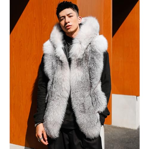 Denny&Dora Chaleco de piel de zorro para hombre, chaqueta de invierno sin mangas, abrigo de piel con capucha, color azul (EE. UU., Alpha, grande, regular, regular, gris)