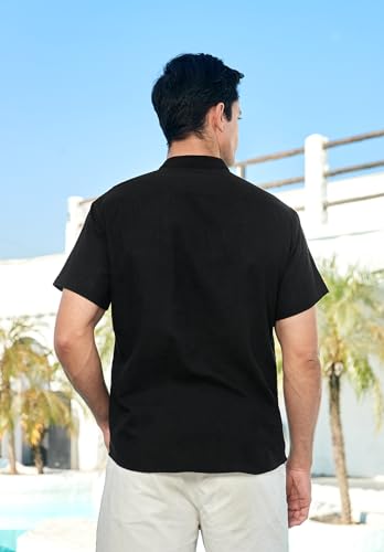 Enlision Camisas Hombre Lino de Algodón Manga Corta Sin Cuello Camisa Casual para Hombres Negra Informal Verano Henley Camisetas con Botónes Tops M