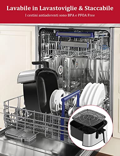 【 Fácil de Limpiar 】 La cesta antiadherente y la bandeja de la freidora aire son de diseño desmontable, limpieza más conveniente. La cesta y la bandeja antiadherentes son aptas para lavavajillas, nota utilice un paño suave no abrasivo para limpiar cuando se lave las manos, solo limpie limpiará. Gracias al revestimiento antiadherente, incluso los residuos de alimentos rebeldes dejarán de ser un problema. Sin BPA ni PFOA garantizar la seguridad alimentaria.