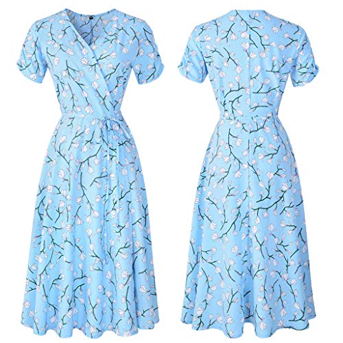 VEMOW Vestido Mujer Fiesta con Estampado Floral Festivo con Cuello en V para Mujer Vestido de Fiesta de Manga Corta(Azul,XL)